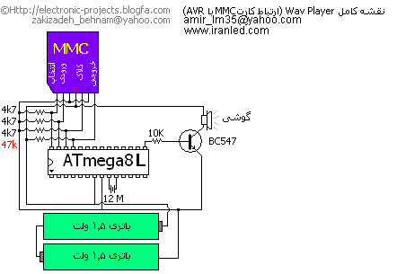 اینم مدار یه mp3 پلیر ساخته با میکروکنترلر ATmega 8 و حافظه فلش MMC البته من خودم هنوز نساختمش ولی در هر صورت از نظر مصرف قطعات و انرژی بهینه شدست.